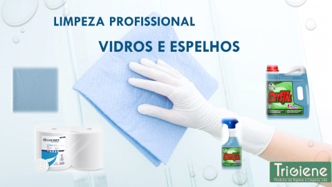 Na limpeza profissional de vidros e espelhos recomendamos o produto Crystal com a utilização do Pano Microfibras Premium ou o Rolo Industrial Branco.